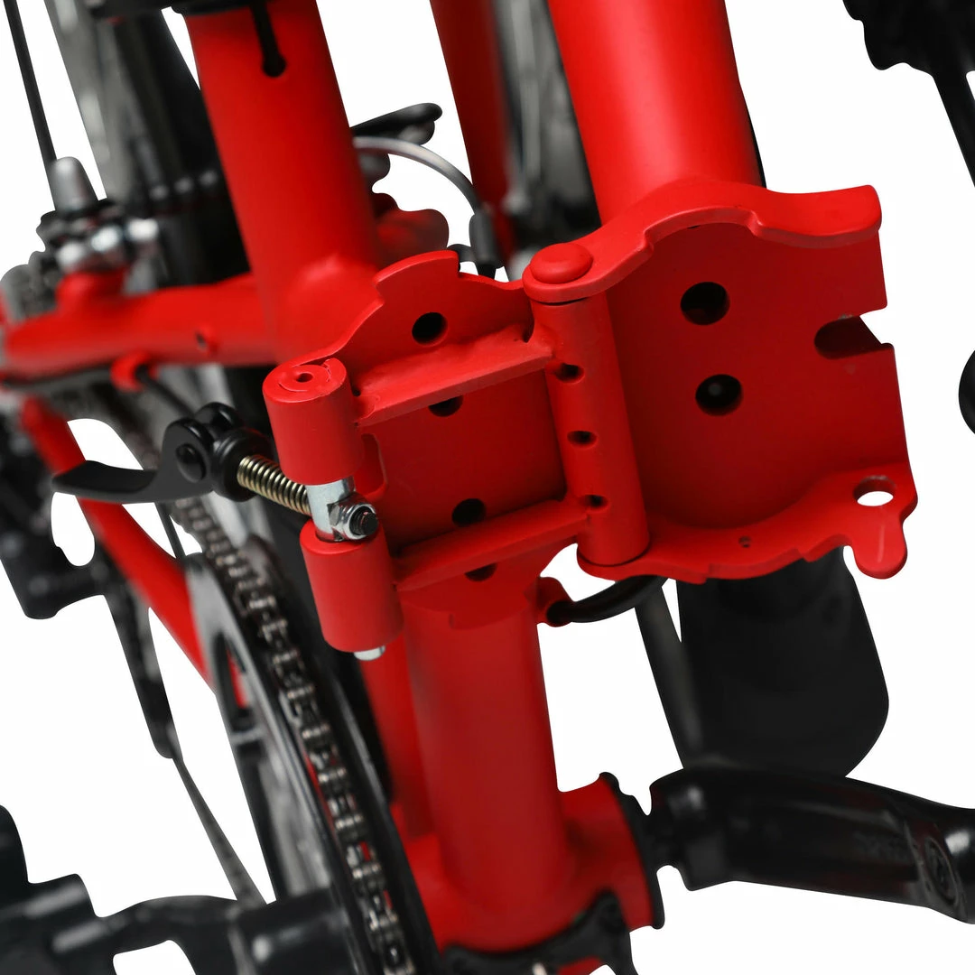 Hi-Ten steel frame. The easy lateral-fold system means the bike takes up little space at home, at the office, in the boot of a car or in a camper… you’ll forget your bike is even there.