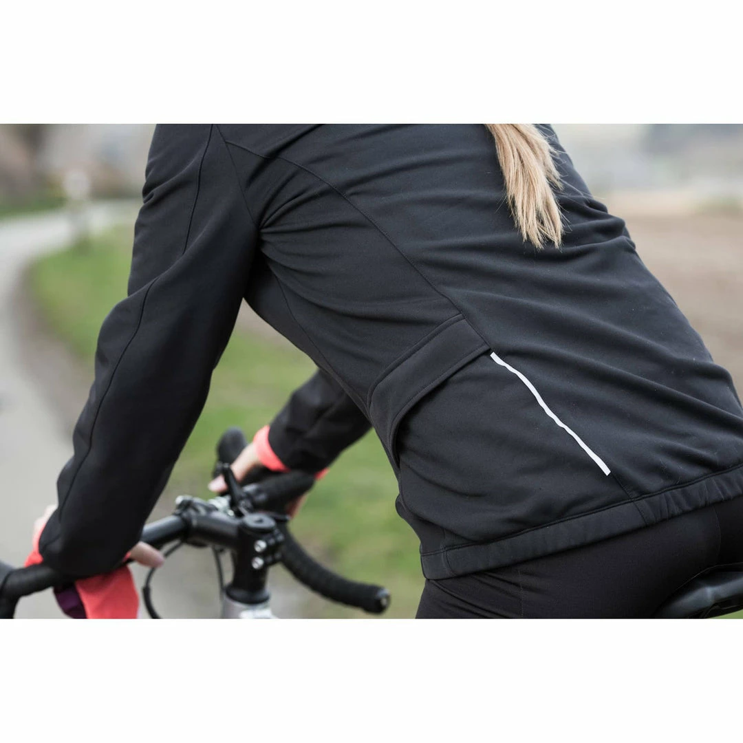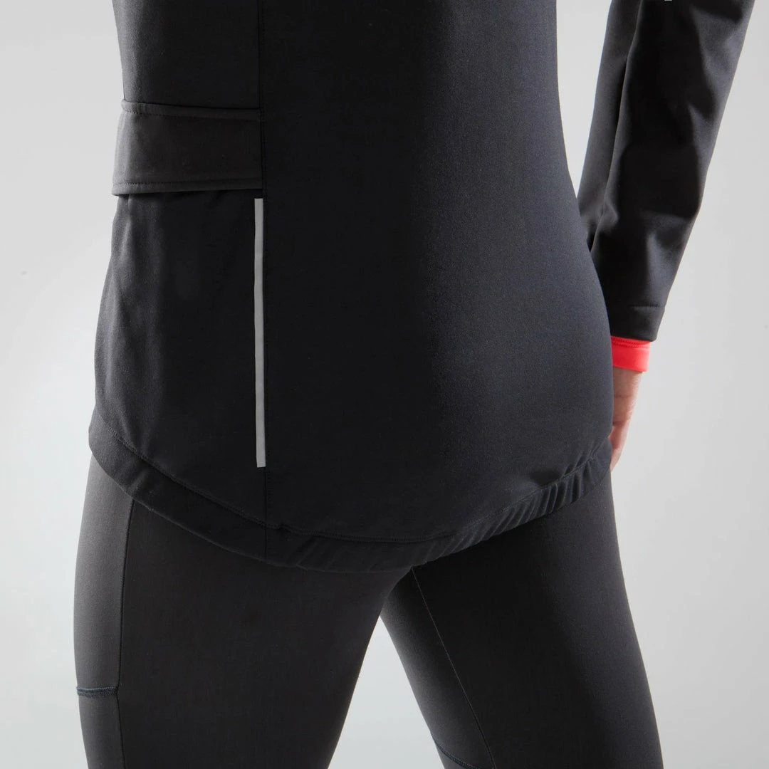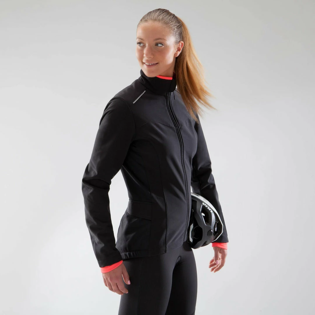 This women’s cycling jacket will keep you warm with its fleece lining and high collar to protect the neck.