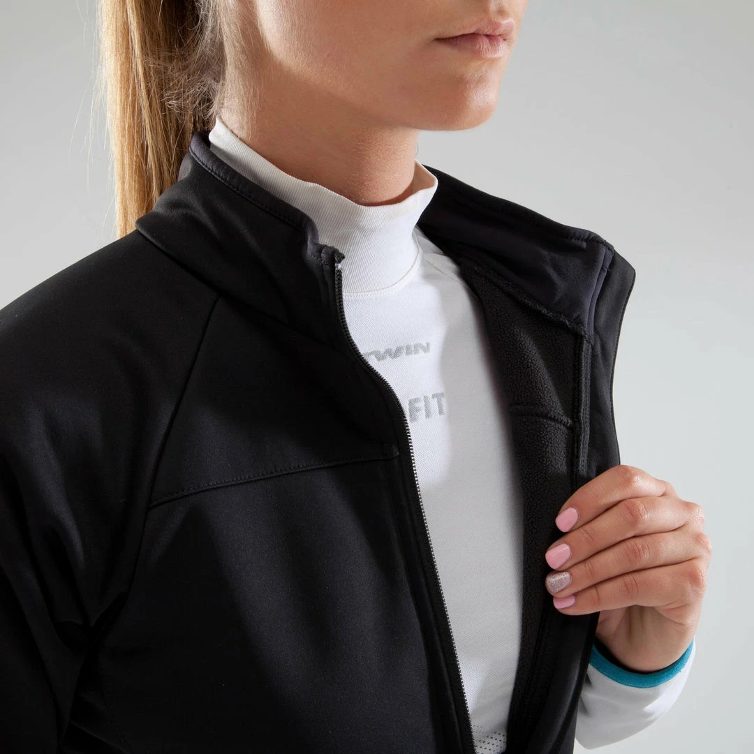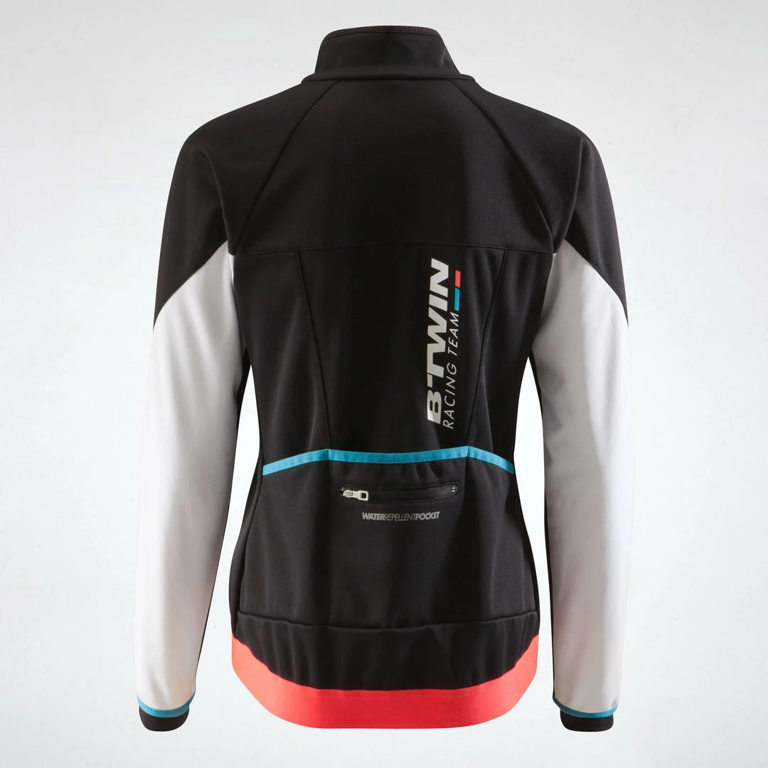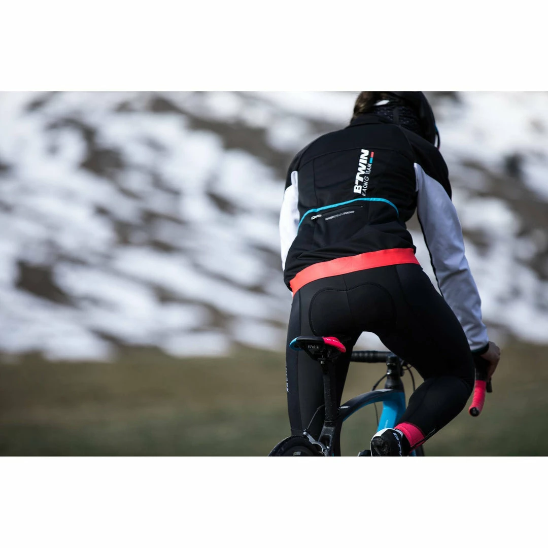 This women’s cycling jacket protects you from the cold with its full, insulating membrane and elasticated waist. High collar protects the face. Mechanical vents under the arms. 3 pockets + 1 secured