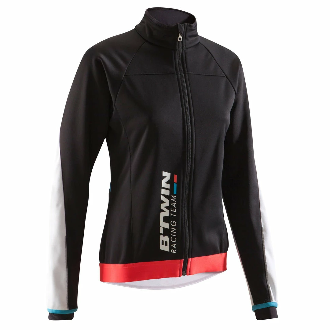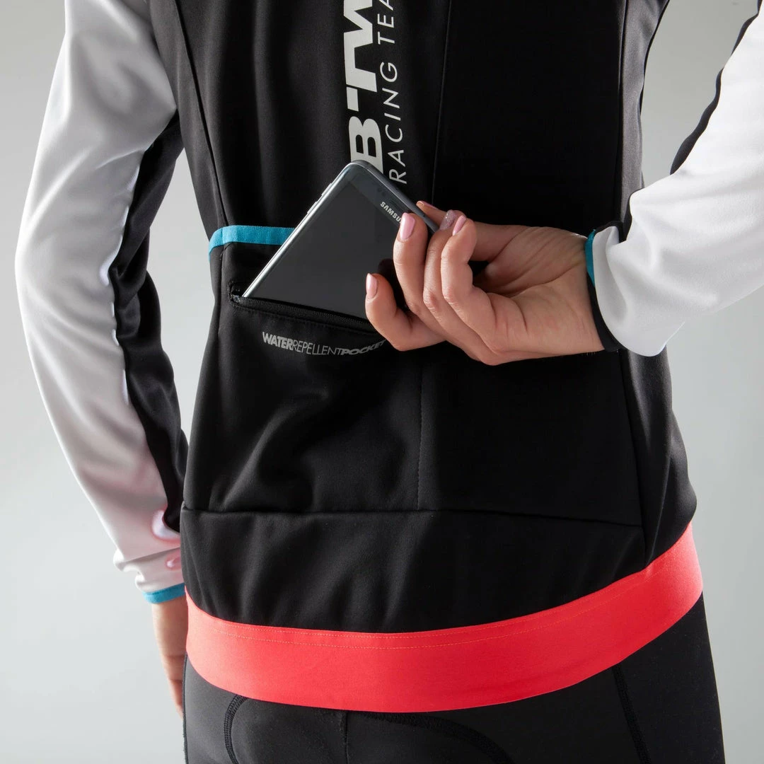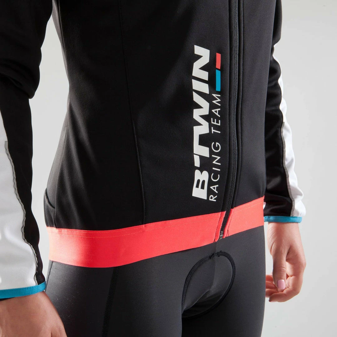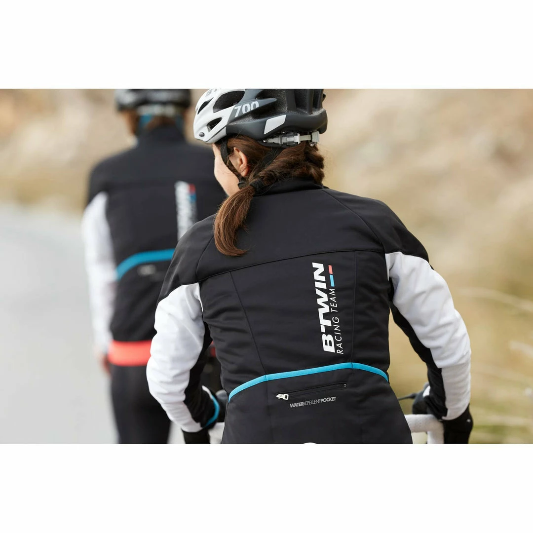 This women’s cycling jacket protects you from the cold with its full, insulating membrane and elasticated waist. High collar protects the face. Mechanical vents under the arms. 3 pockets + 1 secured