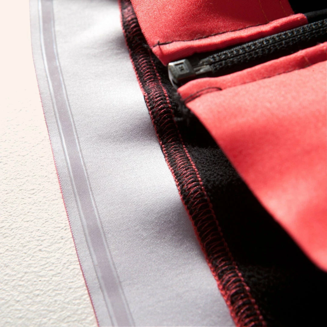 Mesh fabric on the inside of the jacket at the lower back.