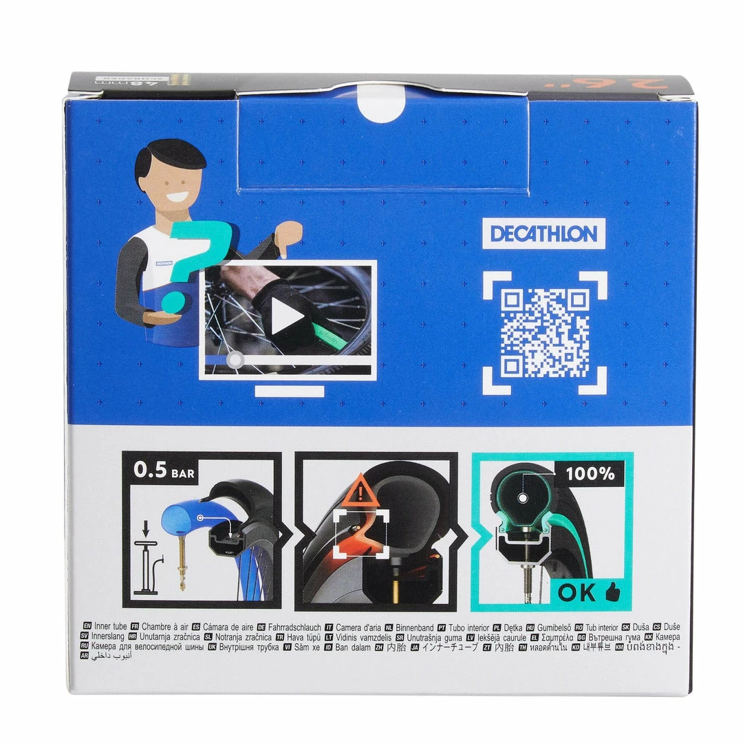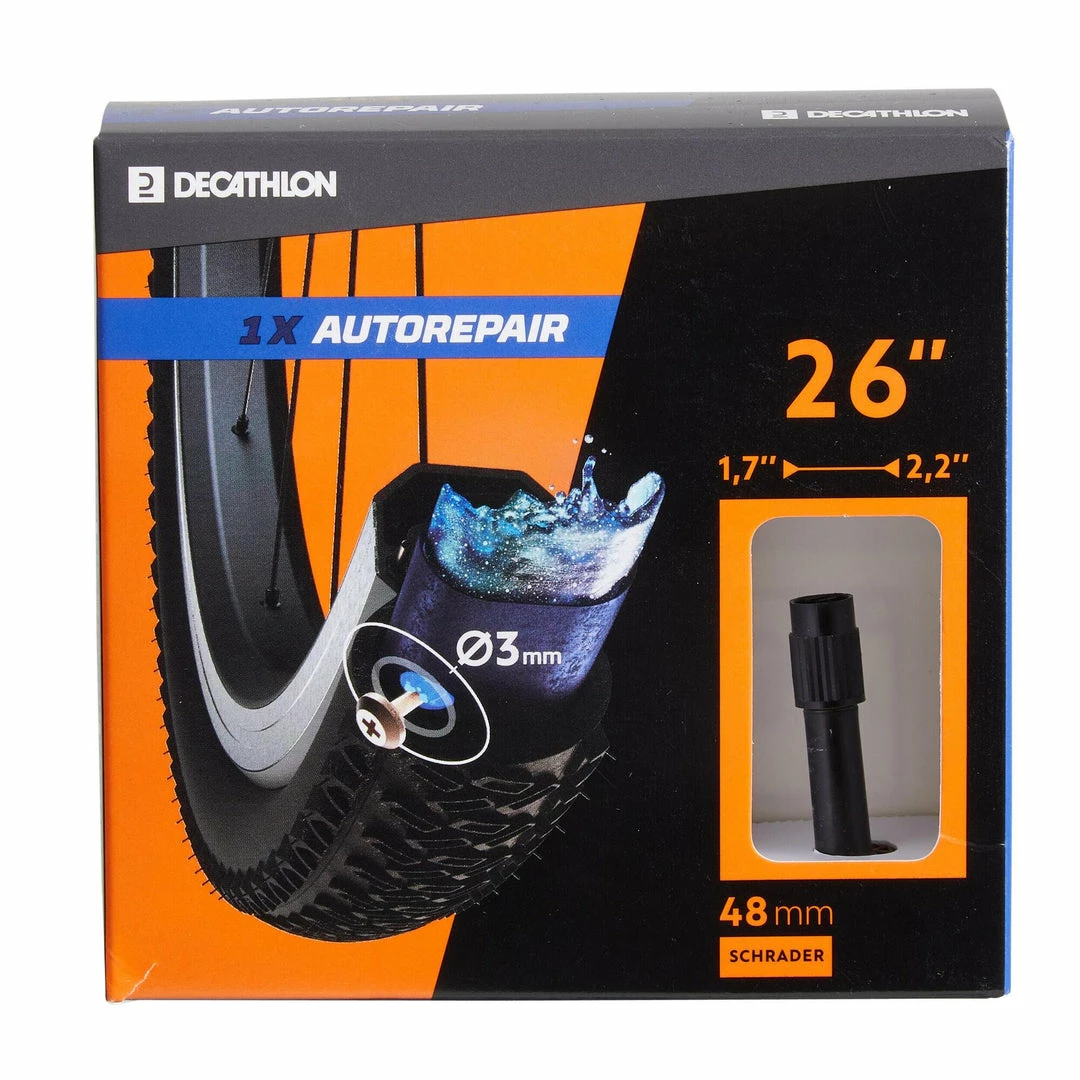 26″ self-repairing Schrader valve inner tube. The preventative liquid inside the inner tube instantly repairs punctures.