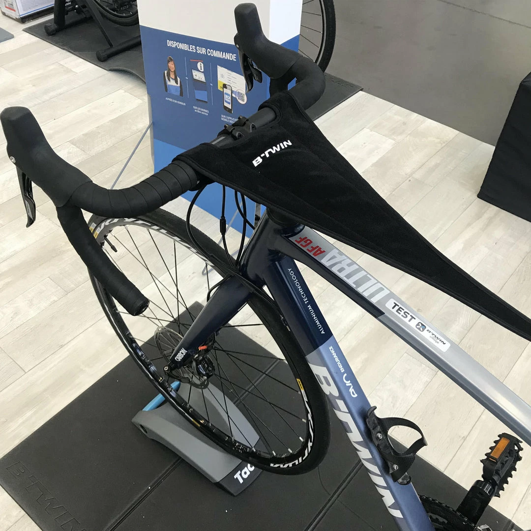 Quick to put on thanks to the easy attachment system, your bike and your floor will be protected from sweat. Handy: storage bag doubles as a water bottle holder.