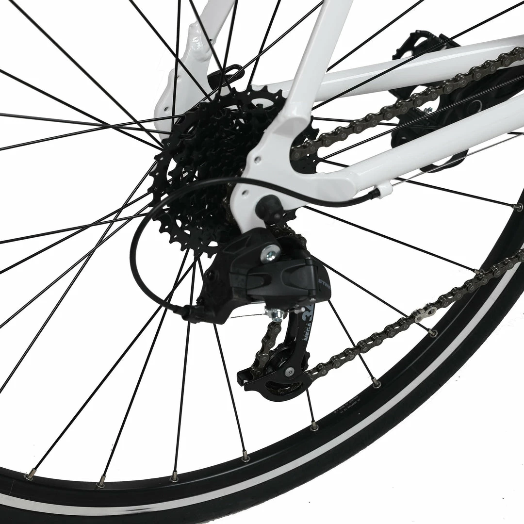 Comfort-oriented frame geometry with a higher steering socket and a shorter top tube that offers a more upright position than a classic road frame. Sloping 6061 aluminum frame with semi-integrated headset.