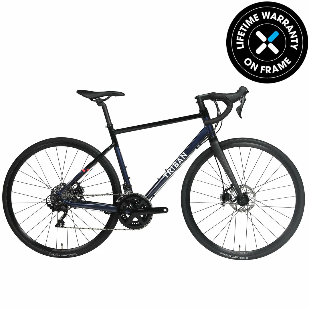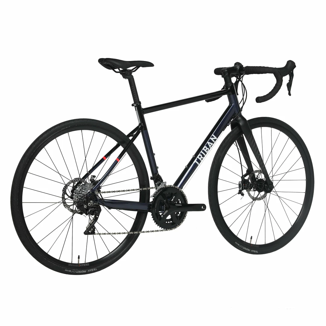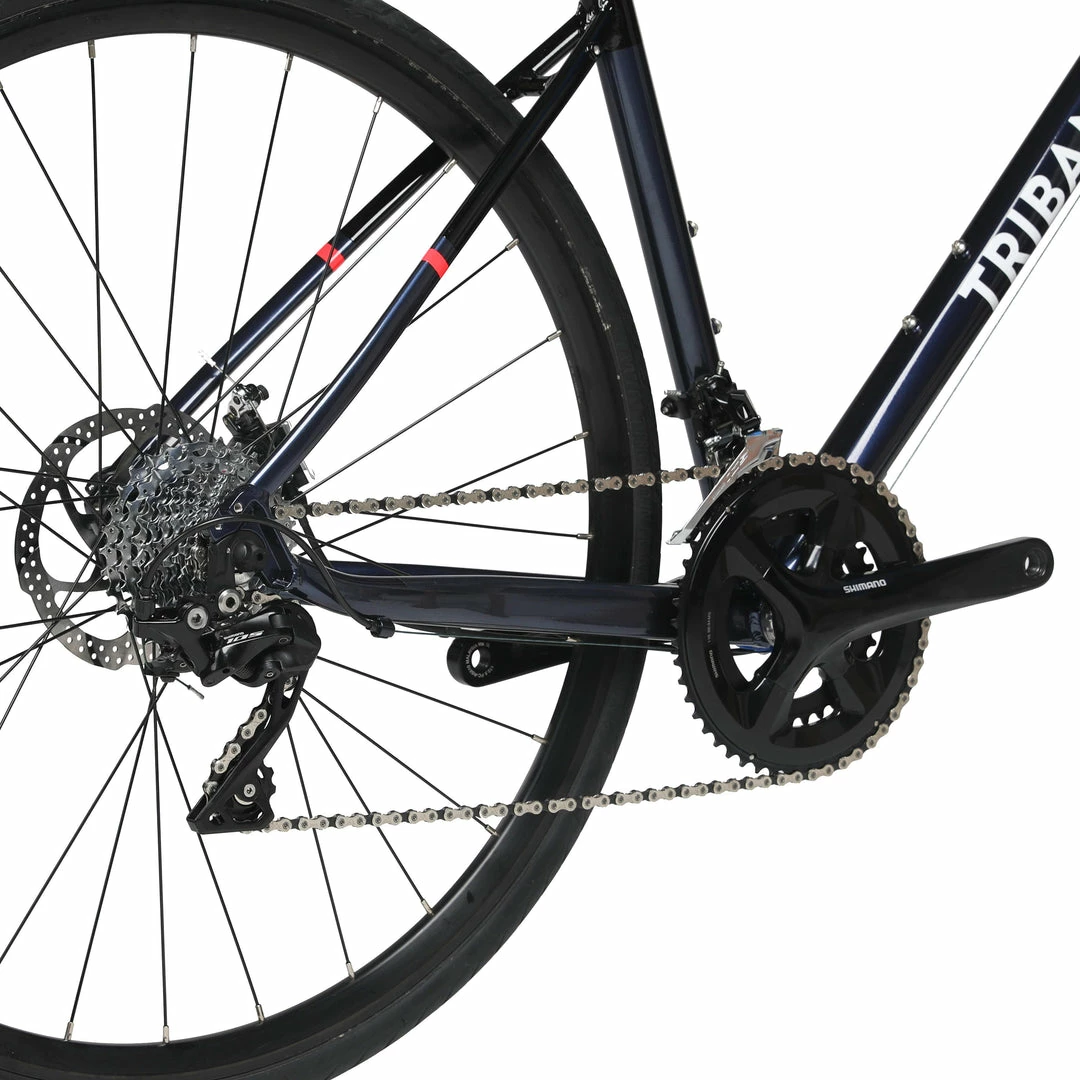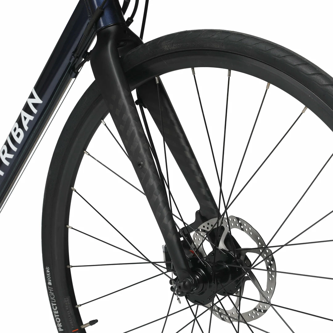 Triban Tubeless Ready Light wheels* 6106T6 aluminum. ETRTO dimension: 622 x 17 C. 24 mm height for increased lateral rigidity. Crossed steel spokes for greater rigidity (28 front and 28 rear). Sealed cartridge bearings. Weight per pair (without cassette and QR): 4.4 lbs *Conversion kit required, including 2 tubeless valves + 2 rim strips + bottle of anti-puncture liquid.