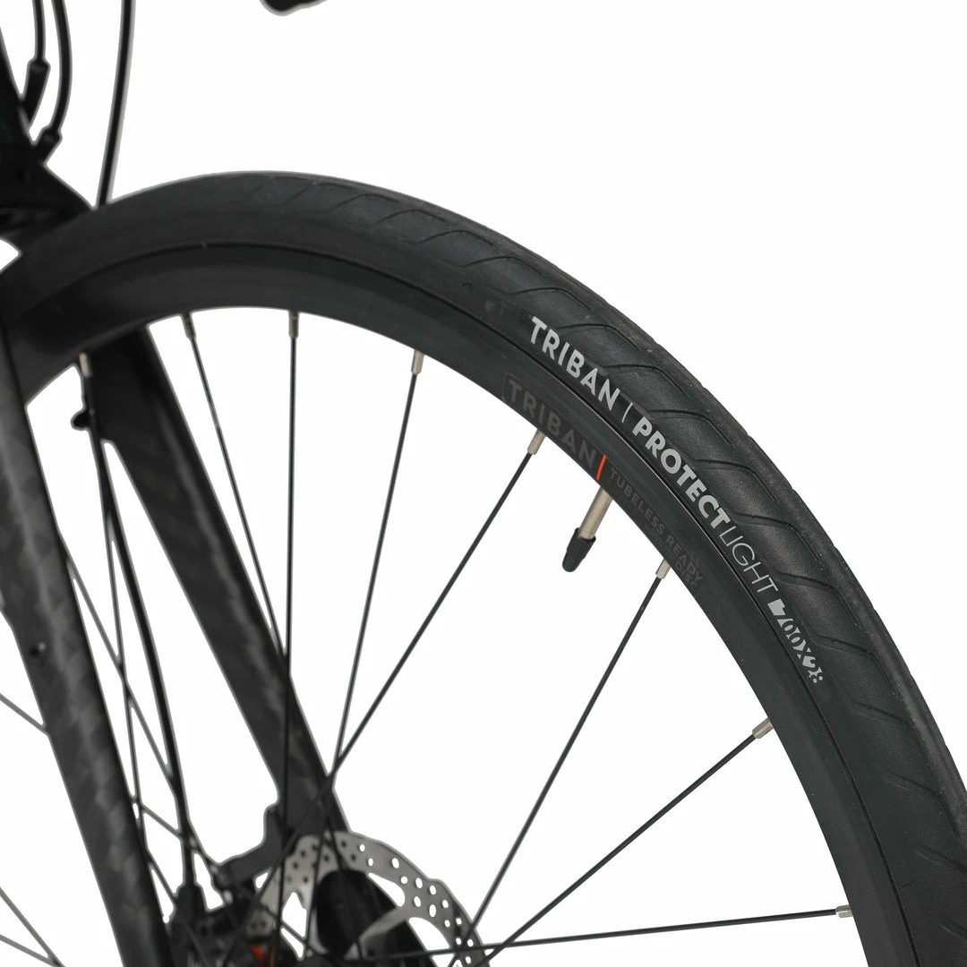 Triban protect light tires 13.8 oz Skinwall stiff bead Nylon anti-puncture protection Durable carcass: 60 TPI. Dimensions: 28c-622 / 700 x 28c for greater comfort Max pressure: 8 bar / 116 psi.