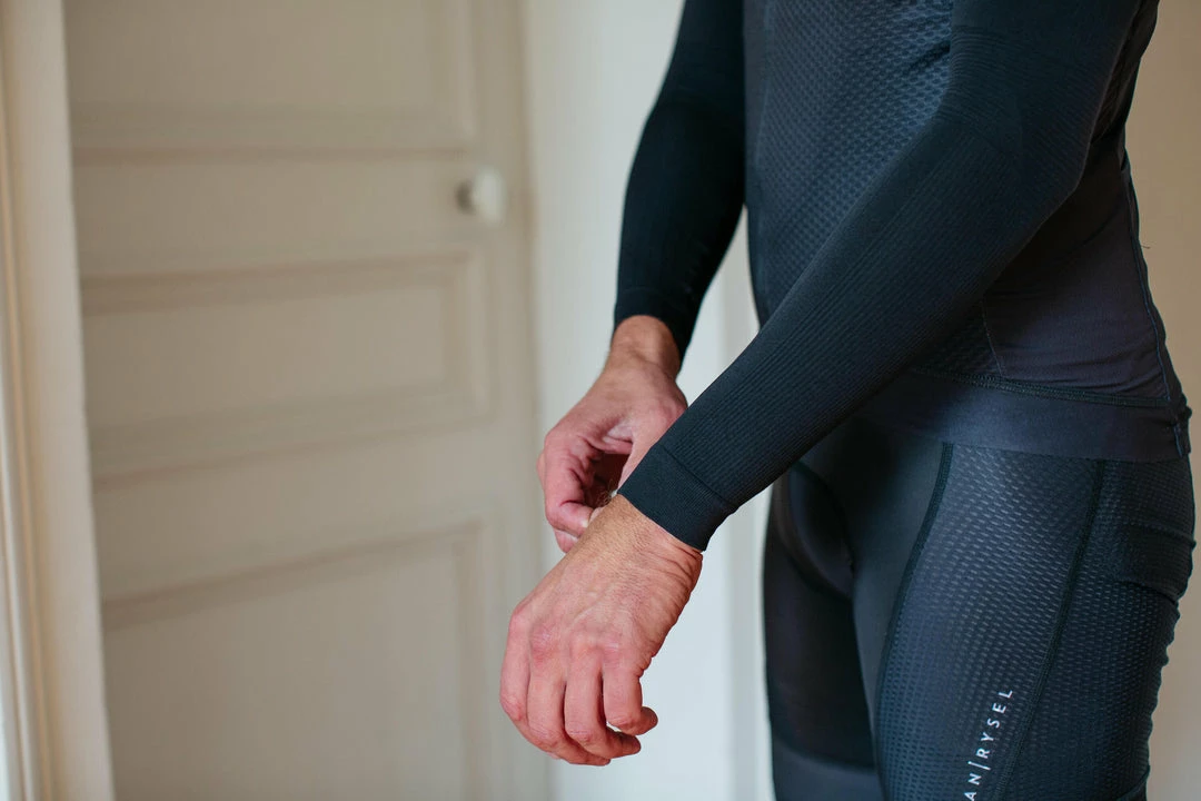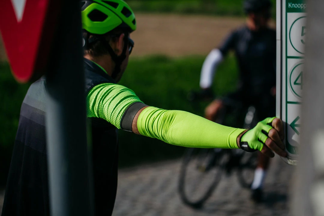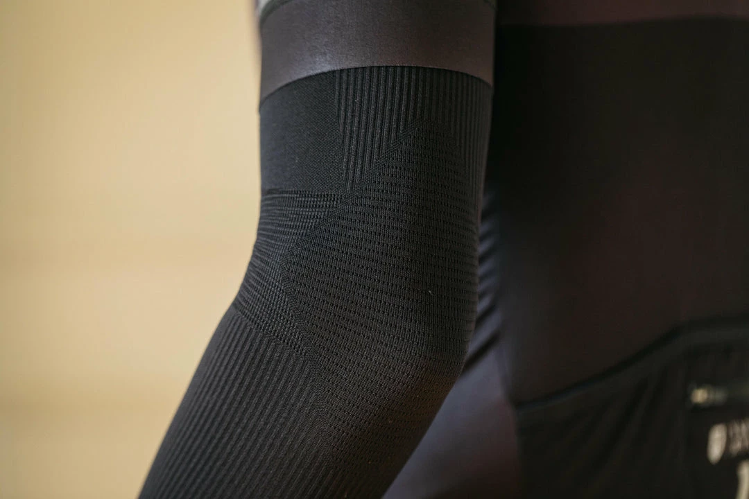 Cold-weather arm warmers are made with “Super Roubaix,” a component also used for our winter cycling shorts. It is a warm component. We recommend them for riding between 45°F and 57°F